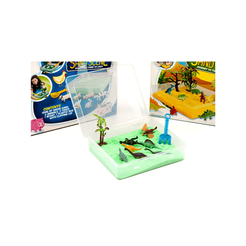 Farm/Dino Sand Scene, je kreatívna piesková sada určená pre deti. Obsahuje priehľadnú plastovú škatuľu, bohatý farebný piesok a rôzne roztomilé dekorácie zvierat. Deti môžu voľne vytvárať na piesku a zariadiť svoje obľúbené dekorácie zvierat a rastlín, aby vytvorili jedinečnú farmu alebo scénu dinosauru. Táto hra dokáže nielen stimulovať kreativitu a fantáziu detí, ale tiež im umožniť dozvedieť sa o zvieratách a prehistorických tvoroch v hre a užiť si šťastný čas učenia.